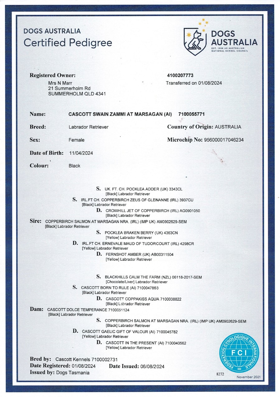 Zammi is the daughter of Sam, my foundation stud dog. She was bred by Cascott Kennels in Tasmania and joined Marsagan when she was eight weeks old. Zammi is in training to be competitive in competing on gundog trials. She was awarded novice gundog of the year 2025 by Widebay Working Gundog Club and Intermediate dog of the year 2025 by the United Field and Retrieving Club.